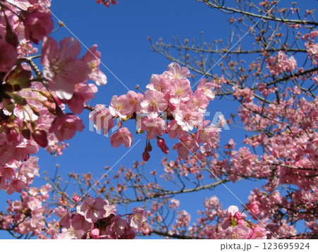 満開になった稲毛海岸駅前の河津桜の桃色の花