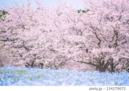 Pink sakura tree and Nemophila at Uminonakamichi Park, Fukuoka