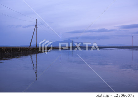 夕暮れ時の夏の岱明海床路 満潮時 熊本県玉名市