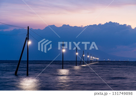 夕暮れに染まる海と雲仙普賢岳のシルエットと長部田海床路の灯り