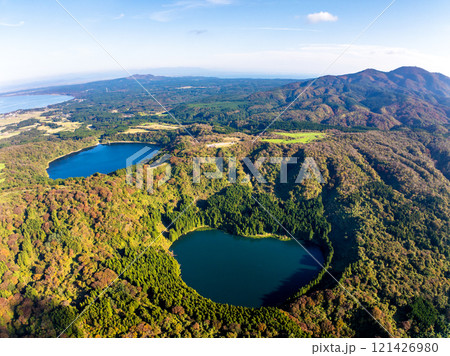 男鹿半島の二の目潟と一ノ目潟と寒風山(秋田県男鹿市)※遠方は能代市