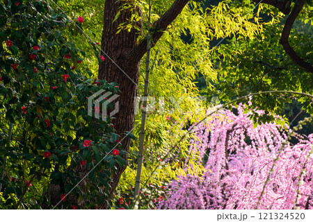 山梨県南アルプス市曲輪田 朝の大和川沿いの桜やシダレザクラ、椿などの並木