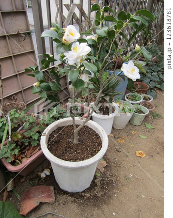 鉢を一サイズ大きくした白い花の咲くツバキ