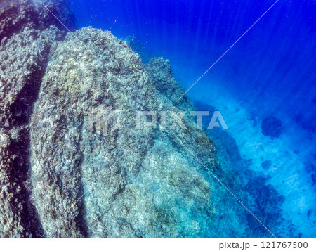 水中洞窟にいる美しいサザナミヤッコ(キンチャクダイ科)の幼魚他。伊豆半島南伊豆町中木ヒリゾ浜2023