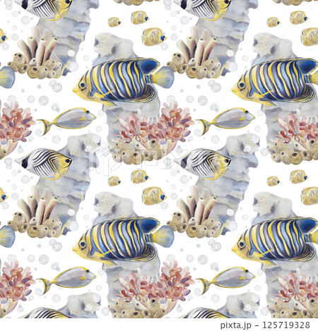 Seamless pattern with tropical striped fish. Seaweed and echtinia on the seabed. Coral reef. Underwater world. Bubbles and sea sponges. Watercolor illustration without background. Hand drawing.