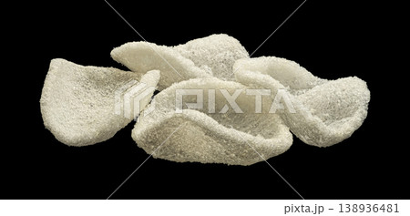 Falling japanese prawn crackers isolated on black background, traditional Asian restaurant snack, full depth of field