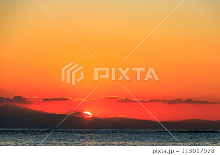 ビーチから眺める美しい夕日と富士山のシルエット。 日本国神奈川県三浦市、荒井浜海水浴場にて。 20