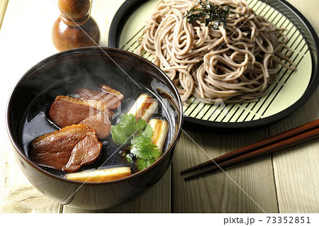 ロースト鴨肉と焼長葱と三つ葉の入った鴨せいろ蕎麦と瓢箪型の七味入れと箸