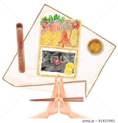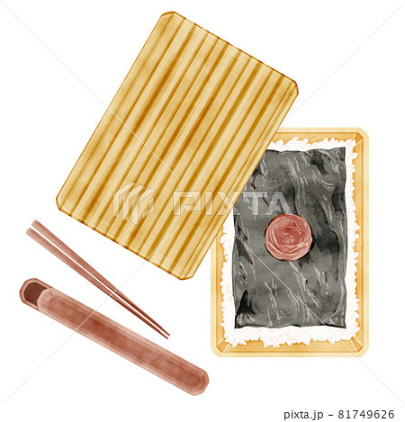 昼食にのり弁当を食べる手書き水彩風イラスト