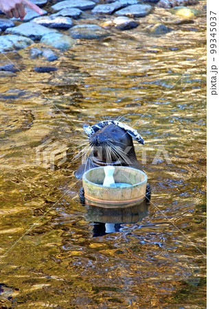 トレーナーさんからご褒美を貰う1頭のゴマフアザラシ 北海道