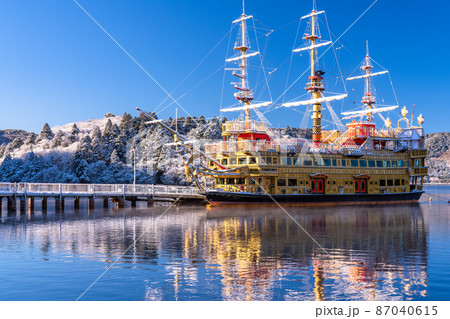 (神奈川県)箱根町港に停泊中の遊覧船(海賊船) 後方に富士山
