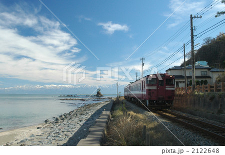 対岸の立山連峰を背景に海沿いを走る氷見線電車