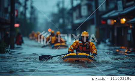 洪水・水害・水没・大雨・豪雨台風・自然災害の被災地に救助に行くカヤックに乗った救助隊