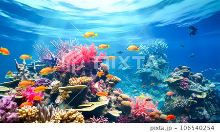 岩と珊瑚がある海中を熱帯魚が泳ぐ背景イラスト_16:9