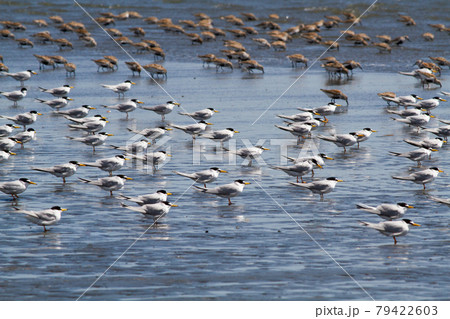 海の浅瀬に大群で降り立ち同じ方向を見ているコアジサシ