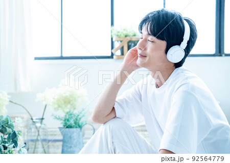 ヘッドホンで音楽を聴く若い男性