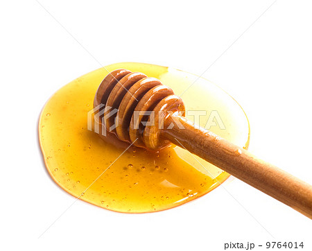 Honey dripping from a wooden honey dipper isolated on white back