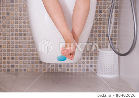 Legs of a child sitting in the toilet hanging from the toilet. Digestive disorders concept in children, rotavirus, intestinal microflora, close-up