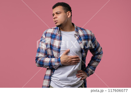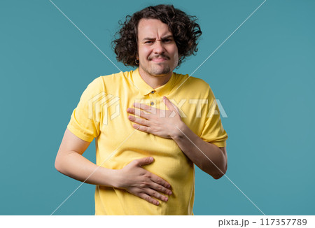 Man squeezing belly with hands because of abdominal pain. Adult guy suffering from stomach ache. Healthcare, problems digestive system, food poisoning or bowel flatulence concept