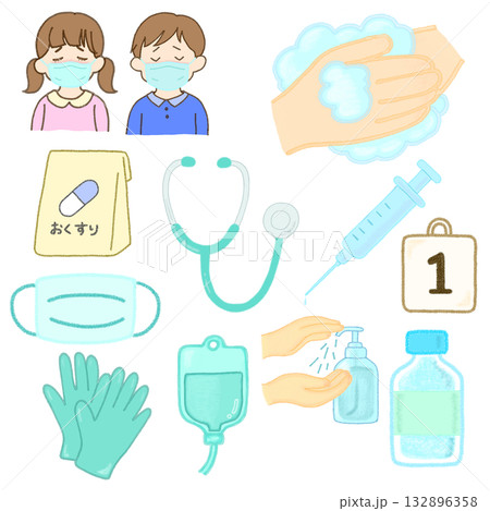 手洗い・感染症・ウイルス対策にまつわる手描きイラスト(カラー)