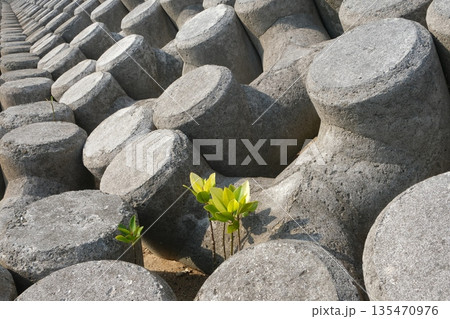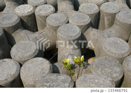 消波ブロックとヤエヤマヒルギの苗
