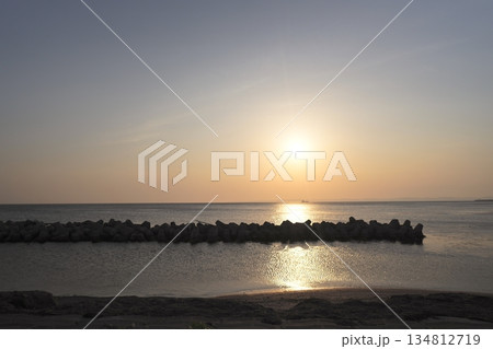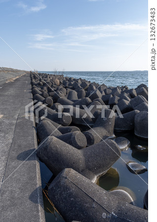 内海海岸のテトラポッドと穏やかな波 海へ続く防波堤の風景(愛知県南知多町)