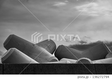 積み重なる消波ブロックのモノクロ構図