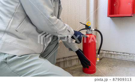 消火器の点検をする作業服の男性 ビルメンテナンス イメージ