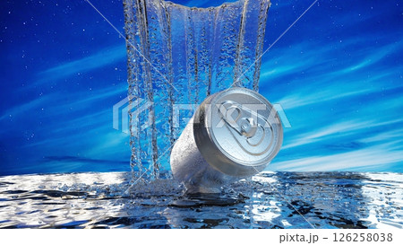 アルミ缶と弾ける水しぶきと青空の3Dイラスト
