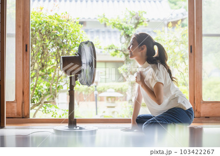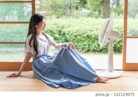 古民家の縁側で扇風機の前でくつろぐ若い女性