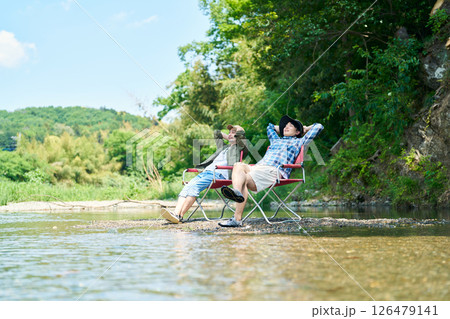 キャンプ 川に足をつける女性