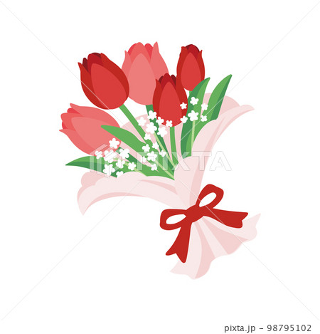 かわいいリボンで束ねられた赤色のチューリップとかすみ草のブーケ