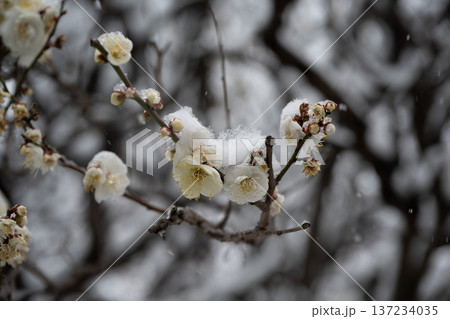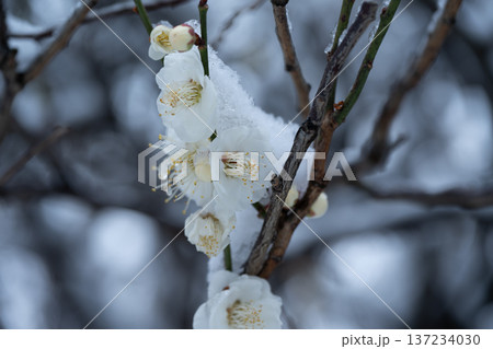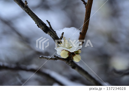 梅の古木にうっすら雪、春待つ情景