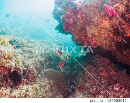 美しいアカハタ、ソラスズメダイ他の群れウミトサカ、イボヤギ他のソフトコーラルが群生する岩礁 ヒリゾ浜