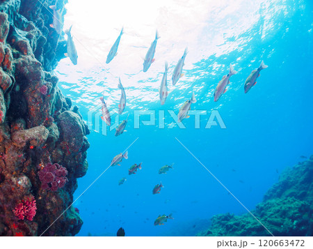 ムラサメモンガラ、ギンガメアジ、モンツキアカヒメジ他。美しいサンゴ礁と熱帯魚の群れ。 嘉比島沖縄県