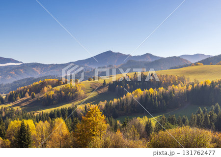 Scenic landscape view of an autumn mountain valley with lush forests rolling hills and clear blue sky. Northwest of Slovakia, Europe.