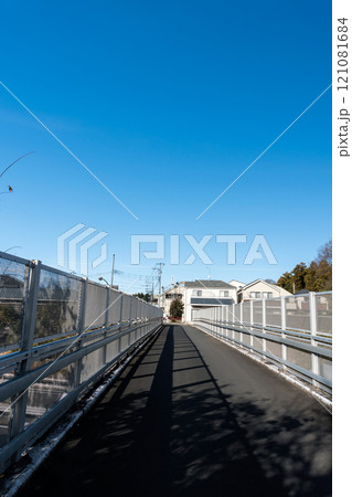 池の上橋(高速道路:中央自動車道の上)に続く坂道 冬晴れの青空と紅葉 東京都調布市深大寺南町1丁目