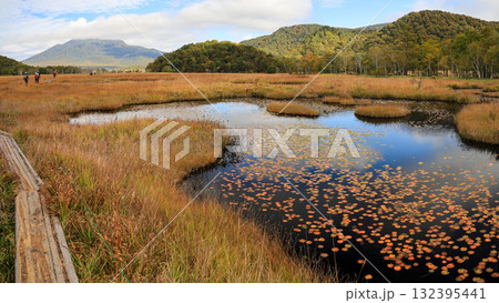 秋の尾瀬、草モミジの紅葉に包まれた尾瀬ヶ原と尾瀬沼トレッキング、群馬県,日本