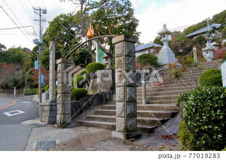 甲山の南側の山麓に位置する甲山大師神呪寺 大師道より遍照金剛と左右に書かれた石門から階段を上がる