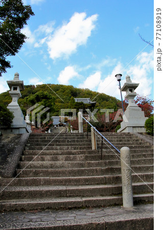 甲山の南側の山麓に位置する甲山大師神呪寺 大師道より階段、灯籠、本殿、甲山そして青空を望む 縦位置