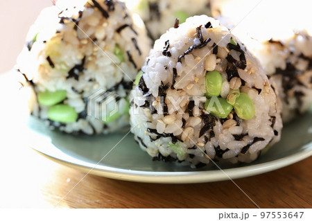 三角に握った塩昆布と枝豆の混ぜ込みおにぎり