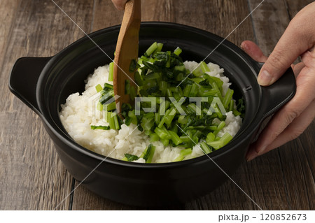 菜飯 土鍋で炊いた白米に塩茹でした蕪の葉を混ぜる