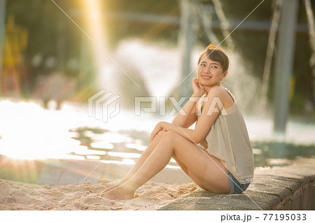 夕焼けのケアンズラグーンに佇むハーフの素敵な女性