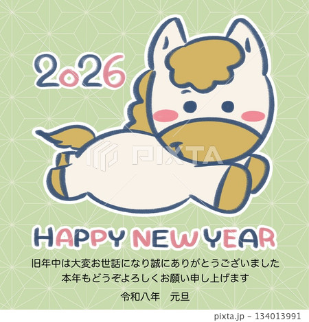 馬のパターンの年賀状 午年 2026 横 かわいい イラスト