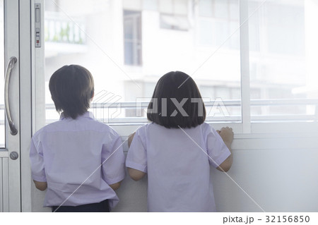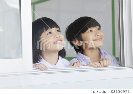 A schoolboy and a schoolgirl are standing near window and looking at outside