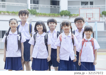 A photo of Thai pupils sitting, studying, smiling and looking at camera.