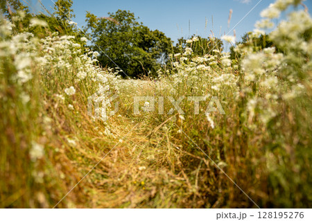 Blooming Wildflower Field In Slovenia: Soft-Focused Meadow Of White Blossoms Gently Swaying Under Summer Sunlight With Mountains And Trees In The Distant Background