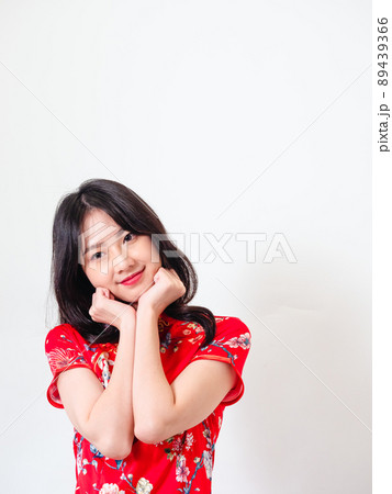 穿著傳統旗袍的年輕亞洲女性,在白色背景前爽手握住臉龐。