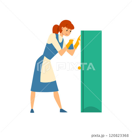 Cleaning Woman Wiping Dust from Cabinet with Sprayer, Maid Character Wearing Uniform with Blue Dress and White Apron, Cleaning Service Vector Illustration