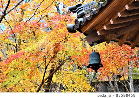 赤や黄色の紅葉を背景にお寺の立派な瓦屋根の角に垂れ下がった鉦の風鈴、晩秋の美しい風情のある風景